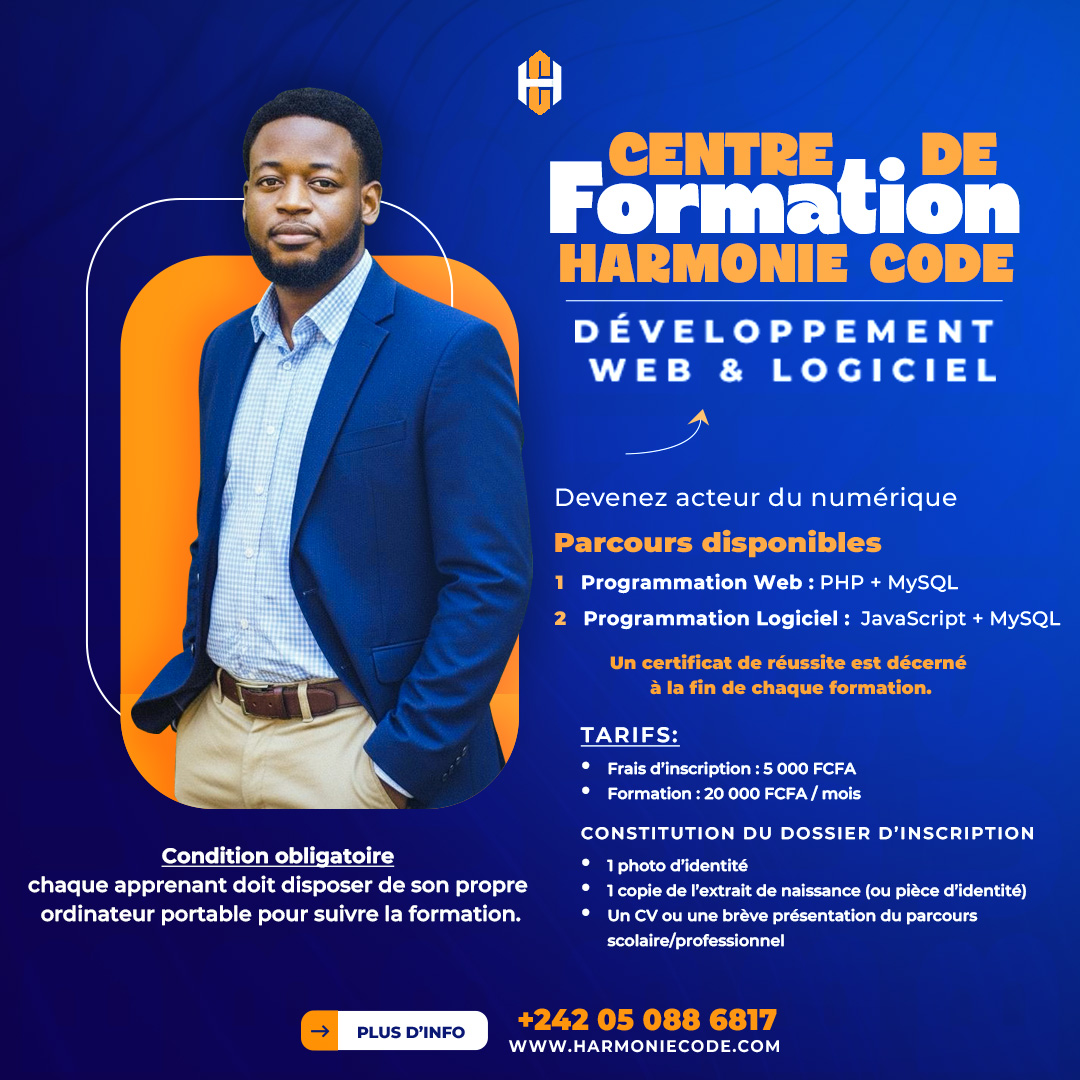 Devenez acteur du numérique, en présentiel ou en ligne ! Le monde évolue à une vitesse incroyable, et les métiers du numérique sont aujourd’hui parmi les plus recherchés. Notre Formation en Développement Web & Logiciels vous ouvre les portes d’un avenir prometteur dans le domaine de la programmation, de la création de sites web et de la conception de logiciels professionnels. Pourquoi suivre cette formation ? Apprendre à coder, c’est apprendre à créer, innover et bâtir son avenir. Notre programme est conçu pour rendre chaque apprenant autonome, compétent et opérationnel, que ce soit pour intégrer une entreprise, devenir freelance ou lancer ses propres projets numériques. Chaque participant bénéficie d’un encadrement pratique, d’exercices concrets et d’un enseignement orienté projet. À la fin de la formation, un certificat de réussite est délivré à chaque apprenant, attestant de ses compétences acquises. Disponible en deux formats : Présentiel : pour ceux qui souhaitent apprendre dans un cadre collectif et encadré. En ligne : pour ceux qui préfèrent apprendre à distance, à leur rythme, avec le même accompagnement.