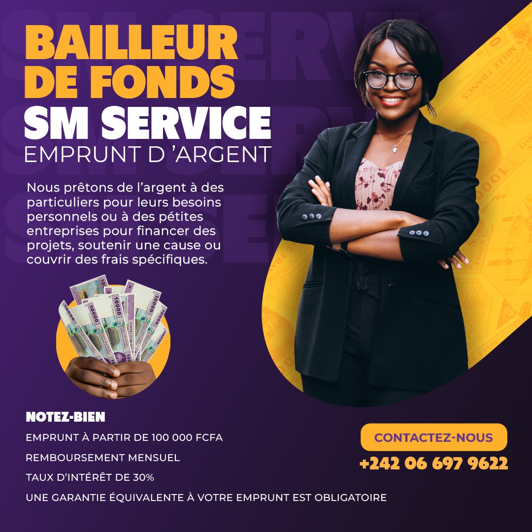 Dans un contexte économique où il est souvent difficile d’obtenir un financement rapide et sûr, SM Service se présente comme une solution fiable et accessible pour tous ceux qui ont besoin d’un soutien financier. Créée par Stécie Merveille, une jeune entrepreneuse congolaise ambitieuse et polyvalente, SM Service est une entreprise locale spécialisée dans l’emprunt d’argent à des particuliers et à de petites entreprises. Son objectif : aider les Congolais à concrétiser leurs projets, à développer leurs activités ou à faire face à des besoins urgents.